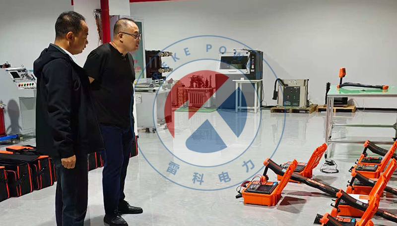 隨后,代表團深入雷科電力的生產與研發區域。在整潔有序的車間內,代表團的目光被一款正在進行的設備所吸引——這正是雷科電力近期研發的重點產品 REKE-2190智能電纜綜合探測儀。